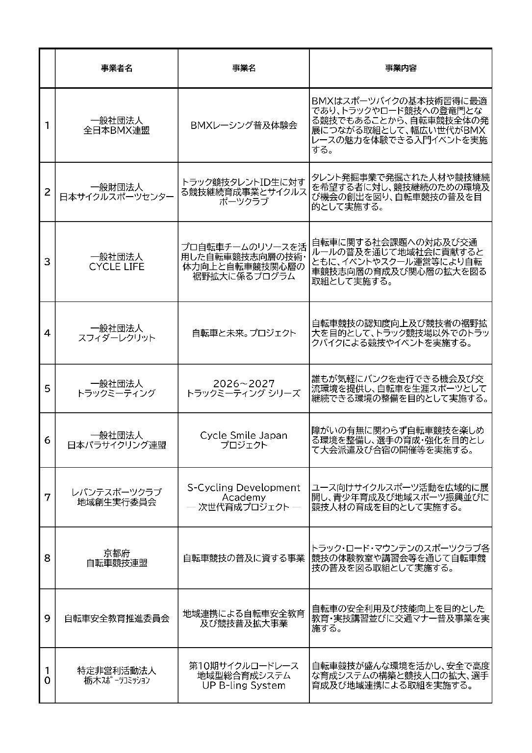 本事業は、自転車競技の普及促進を目的として実施するものであり、各事業者から申請のあった事業について、4月に開催された審査委員会において審査を行い、助成対象事業を決定したものです。